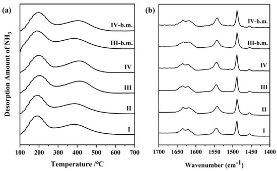 (a) Temperature-programmed desorption of ammonia (NH3-TPD) profiles of various ZSM-5 zeolites; and (b) infrared spectra of adsorbed pyridine on various ZSM-5 zeolites at a desorption temperature of 150 °C.