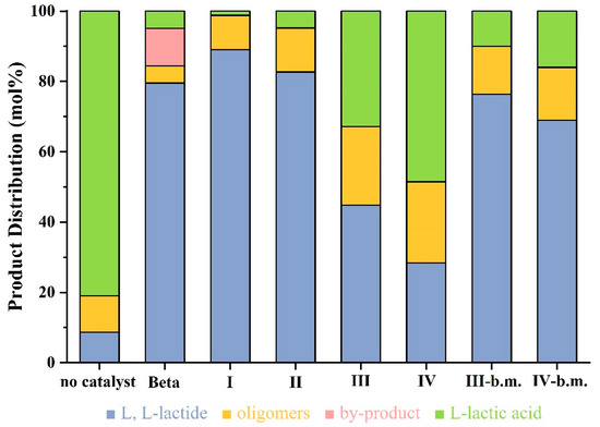 When we ball milled the micron-sized III and IV samples into the nano-sized III-b.m., IV-b.m.-15 min, and IV-b.m. (30 min) samples, the L, L-lactide conversion and selectivity increased significantly. In particular, IV, IV-b.m.-15 min, and IV-b.m. (30 min) continuously improved the catalytic performance (Figure S5). The ball-milled catalysts not only exposed more internal acid sites but also improved the reactant/product mass transfer, which is also consistent with the results of the surface-poisoning experiments. Furthermore, the change in morphology during the ball-milling process, i.e., break down in the longest dimension, may also have contributed to increasing the exposure of the straight 10-ring channel. As a consequence, the catalytic performance improved due to the shorter diffusion path. In general, besides reducing the particle size of the primary catalyst, the effect of the external (liquid–solid) mass transfer resistance can be eliminated by increasing (a) the amount of catalyst and (b) the reaction temperature [19]. However, the amount of catalyst is limited by the net adsorption of the reactant/product by the catalyst, while the reaction temperature is limited by the side reactions. The internal (pore diffusion) mass transfer is determined by the intrinsic pore size and pore volume of ZSM-5. Based on the results of the experiments, both external and internal mass transfer influence the overall effectiveness of the mass transfer. Further work to evaluate the contributions of both internal and external mass transfer is being conducted in our laboratory.