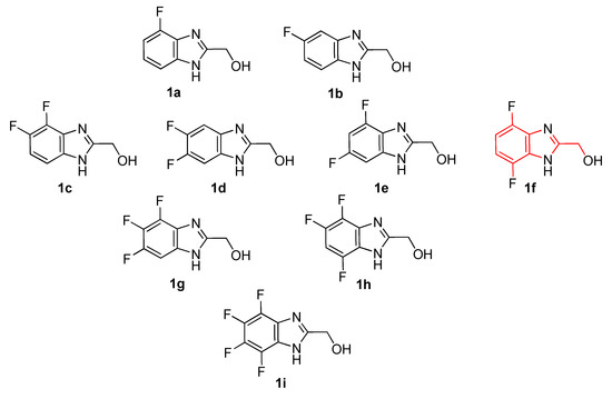 Synthesized in this work (black) and still challenging (red) (benzo[d]imidazol-2-yl)methanols fluorinated on the benzene ring, 1a–1i.