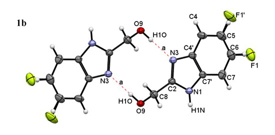 In the investigated benzimidazoles, aromatic nuclei are perfectly planar, and the bond lengths and bond angles are very close to or the same as statistical means [56]. Torsion angles between the aromatic cycle and hydroxymethyl group are in the broad range from 8.12° to 84.45°. These conformation differences are due to dissimilarities in the binding of the molecules through intermolecular H-bonds N–H…O, O–H…N, and C–H…F (Table 1).