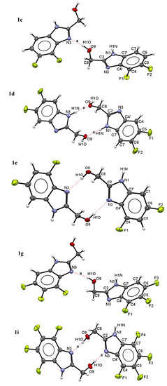 Molecular and crystal structures of benzimidazoles 1b–e, 1g, and 1i were solved by single-crystal X-ray diffraction. The X-ray crystallographic analyses revealed that 1b and 1e crystallize in triclinic P–1 space groups, 1c and 1g both crystallize in the monoclinic C2/c space group, whereas 1d in the P21/c space group, and 1i in the tetragonal P41212 space group. ORTEP diagrams of dimer H-bonded structures drawn with 50% ellipsoid probability and numbering schemes for these compounds are depicted in Figure 2 below. The diagrams confirm the expected substitution patterns for the synthesized fluorinated benzimidazole series.