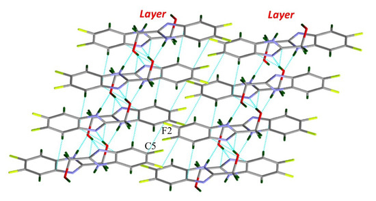 In 1c, 1d, and 1g containing two or three adjacent fluorine atoms on the benzene ring, the binding of dimeric synthons via N–H…O and O–H…N hydrogen bonds causes the formation of layers. The compounds 1c and 1g are highly isostructural; they both contain a fluorine atom at position 4, also participating in the crosslinking of molecules into layers (Figure 4a). Then, the layers are combined similarly through intermolecular CCH2–H…F hydrogen bonding and π–π stacking interactions into the final structure (Figure 4b and Supplementary Materials). As for compound 1d, in its crystals, the supramolecular self-organization of layers is implemented through interlayer short contacts between atoms F2 and C5 (Figure 5).