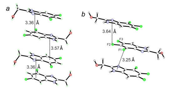 In addition to the preceding discussion of how fluorinated (benzo[d]imidazol-2-yl)methanols are bound through H-bonds, their forced mutual orientation is also of interest. Benzimidazole moieties of neighboring molecules are arranged into slipped-parallel stacks with head-to-tail or head-to-head orientations. The distances between planes of aromatic rings are in the range 3.25 to 3.60 Å, and the intercentroid distances (Cg…Cg) are 3.44 to 3.98 Å; both are characteristic of π–stacking interactions (Figure 7a). In addition to the π–π interactions, nonvalent contacts between the F atoms and π-systems of neighboring molecules (C–F…π interactions, Figure 7b) are present in all the compounds except for 1d in which H…π interactions take place. Atom-to-plane distances F…Cg and H…Cg are 3.25–3.89 and 2.70–2.97 Å, respectively. The energy of these interactions is an order of magnitude or more inferior to the energy of classic H-bonds [57,58]; however, the finding that they take place suggests that they also affect the packing of the fluorinated (benzo[d]imidazol-2-yl)methanols. This observation is worth noting because it indicates that interactions of the C–F…π type are capable of exerting some influence even on such structures rigidly cross-linked by H-bonds.