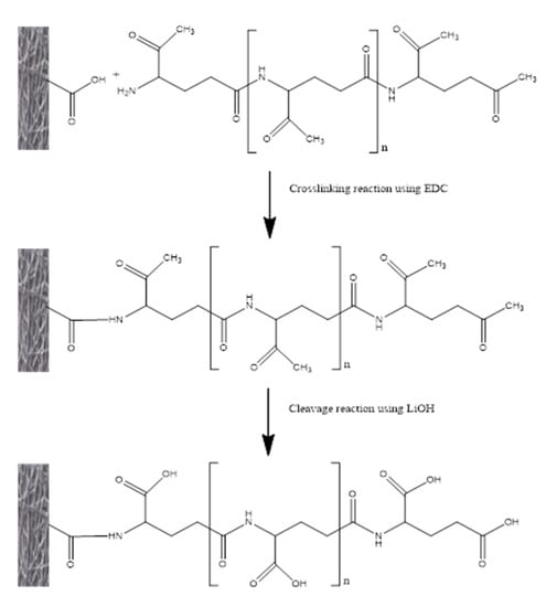 Protocols for functionalization were adapted from Greene and Wuts []. ESM were obtained from commercial White Leghorn chicken eggs. Empty eggs were filled with 1% acetic acid solution for 30 min to detach the membrane from the shell, and then ESM were incubated for another 48 hours in 1% acetic acid solution to eliminate any remaining calcium carbonate crystals, washed three times in deionized water, and manually detached from the shell []. Strips, 3 mm wide × 20 mm long were trimmed off the isolated ESM. Functionalization of ESM with poly-glutamic acid is diagrammed in Figure 1, and the reaction was followed by Fourier Transform Infrared spectroscopy (FTIR) using a FTIR/FTNIR bench-top spectrometer (INTERSPEC 200-X, Interspectrum OÜ, Tartumaa, Estonia).