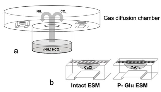 The crystallization assay was based on a variation of the sitting drop method developed elsewhere []. Briefly, the assay consists of a chamber built with an 85-mm diameter plastic Petri dish having a central hole of 18 mm in diameter at the bottom, with the chamber glued to a plastic cylindrical vessel (50 mm in diameter and 30 mm in height) (Figure 2a). Calcium carbonate crystallization was done on micro-bridges located inside the chamber. The micro-bridge is a small bridge (inverted U) manufactured from clear polystyrene, which contains a smooth, 35-µL capacity concave depression able to hold a volume of liquid, essentially a hemispherical micro-well, in the center of the top region of the bridge. Micro-bridges were filled with 35 µL of 200 mM calcium chloride dihydrate solution in 200 mM Tris buffer, pH 9.0. The cylindrical vessel contained 3 mL of 25 mM ammonium bicarbonate. One 3-mm wide X 20-mm long ESM or P-Glu ESM strip was deposited on the top of each micro-bridge with the mammillary side facing down in contact with the calcium chloride solution, leaving enough space between the contour of the strip and the perimeter of the micro-well to allow free diffusion from the chamber to the CaCl2 solution (Figure 2b). Strips ends were attached to the micro-well edges with by double-sided tape. Five replicates of each experiment were carried out inside the chamber at 20 °C for 24 h. After the experiments, and before the ESM strips were taken out of the micro-bridges, the solution inside the micro-well was removed with a micropipette and replaced twice with distilled water, and then it was dehydrated with a 50% to 100 % ethanol gradient solution series. Then the ESM strips were removed, mounted on aluminum stubs with double-sided tape, air-dried for 24 h at room temperature, and coated with gold. After the crystallization assays, the ESM strips mounted on aluminum stubs were analyzed. Crystal morphology was observed and size was estimated on a Jeol JSM-IT300LV (Jeol USA, Inc., Peabody, MA, USA) scanning electron microscope (SEM) operated at 20 kV with an EDX AZTec Oxford detector. Ten randomized selected fields of the SEM micropgraphs of five replicates were used for calculating crystal number and size. Statistical analyses of crystal size and density were done with InfoStat 2014 (Córdoba, Argentina) software. For determining the type of data distribution, a Shapiro–Wilk test was used. The p > 0.05 statistical significance level between the control (ESM) and polycarboxylated eggshell membrane (P-Glu ESM) samples was analyzed by Student t test. Results are expressed as mean ± SD.