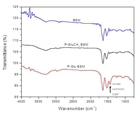 FTIR spectra of intact eggshell membrane (ESM), carboxyl group-protected poly-glutamic acid coupled to eggshell membrane (P-Glu-CH3 ESM), and poly-glutamic acid coupled to eggshell membrane (P-Glu ESM). Ionized symmetric carboxylate groups are shown at 1441 cm−1.