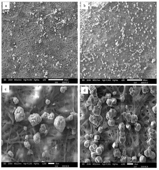 Representative SEM observation of calcite crystals grown on intact eggshell membrane (a,c) vs. growing on poly-glutamic acid-coupled eggshell membrane (b,d). Different kinds of crystal aggregations are shown. Arrows illustrate some mammillary sites.