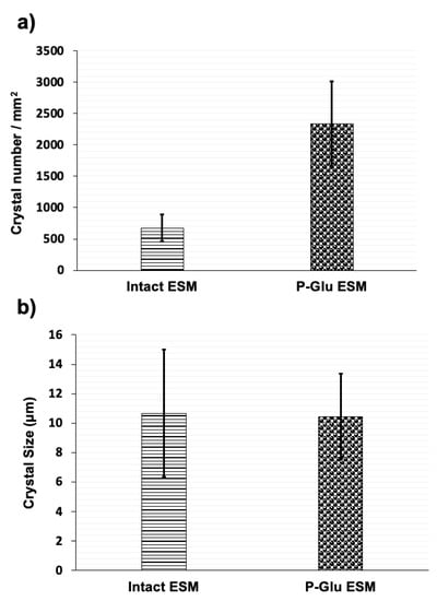 Statistical analysis (mean ± SD) of the density (a) and size (b) of calcite crystals grown on intact eggshell membrane or on poly-glutamic acid-coupled eggshell membrane.