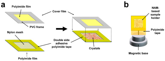 Preparation of the nylon mesh and enclosed film (NAM)-based sample holder for fixed-target serial synchrotron crystallography (FT-SSX). (a) Assembly of the sample holder; (b) the sample holder with magnetic base.