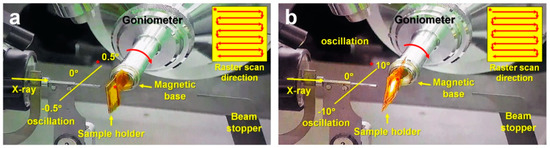 The sample holder for FT-SSX data collection was made on-site by hand, and the basic assembly was similar to that reported previously for NAM-based sample holder consisting of a nylon mesh, polyimide films, PVC frame, and double-side polyimide adhesive tape [36]. However, in this experiment, the size of sample holder was made as small as 10 mm × 10 mm, in accordance with the travel range of goniometer in both horizontal and vertical directions (Figure 1a). During FT-SSX data collection, the goniometer was able to translate 4.5 mm in both vertical and horizontal directions (currently, it can move 8 mm in both directions at 11C beamline in PLS-II). To set lysozyme or glucose isomerase crystals, nylon-mesh with a pore size of 60 μm was used in this experiment. In order to mount the NAM-based sample holder on the goniometer, it (with the crystals) was fixed to a magnetic base using polyimide tape (Figure 1b). Since raster scanning is performed in the direction perpendicular to the X-ray, it is important to fix the sample holder perpendicular to the magnetic base. Accordingly, the upper part of the pin coupled to the magnetic base was removed, and an NAM-based sample holder was horizontally placed on the lower end of the remaining pin and fixed with a polyimide film.