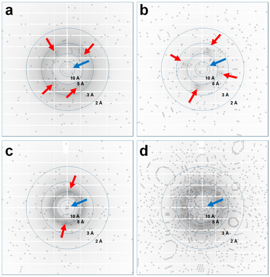 In the raster scan process, X-rays penetrated the nylon mesh and polyimide film, as well as the crystals placed at random locations. The nylon mesh produced 2 (nylon) or 4 (nylon intersection) partial background scattering around 4.30 and 3.75 Å, depending on the fiber direction (Figure 3a–c), and the polyimide film generated a scattering ring at 15.30 Å position (Figure 3). Although the beam characteristics and intensities of XFEL and synchrotron X-rays were different, the pattern of X-ray background scattering from the NAM-based sample holders, generated by synchrotron X-rays, was the same as in the previous FT-SFX using XFEL [36]. On the other hand, there was no significant effect on SNR or CC around 3.75, 4.30, and 15.30 Å resolution, which were the background scattering regions generated from nylon mesh and polyimide film.