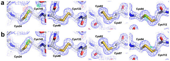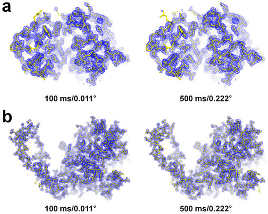 Both 2mFo-DFc (blue, 1.2 σ) and mFo-DFc (green, 3.0 σ and red, −3.0 σ) electron density maps of disulfide bonds of lysozyme by (a) 100 ms X-ray exposure with 0.011° oscillation, and (b) 500 ms X-ray exposure with 0.222° oscillation.