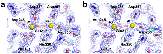 Both 2mFo-DFc (blue, 1.2 σ) and mFo-DFc (green, 3.0 σ and red, −3.0 σ) electron density maps of metal binding sites in glucose isomerase by (a) 100 ms X-ray exposure with 0.011° oscillation, and (b) 500 ms X-ray exposure with 0.222° oscillation.