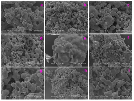 Scanning electron microscopy (SEM) images of Eu- and Gd--doped HA samples synthesized here. Detail of: HA-Eu1 at 5 μm (a) and 10 μm (b); HA-Eu2 at 5 μm (c) and 10 μm (d); HA-Eu3 at 5 μm (e) and 10 μm (f); HA-Eu4 at 5 μm (g) and 10 μm (h); HA-Gd at 5 μm (i).