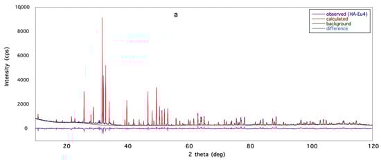 Powder XRD data of HA-Eu4 and HA-Gd samples were collected for structural analysis by using an automated Rigaku RINT2500 laboratory diffractometer (Rigaku Co., Tokio, Japan). Working at room temperature at 50 kV and 200 mA in Debye Scherrer geometry, the equipment uses an asymmetric Johansson Ge (111) crystal to select the monochromatic Cu Kα1 radiation (λ = 1.54056 Å) and the silicon strip Rigaku D/teX Ultra detector (Rigaku Co., Tokio, Japan).
