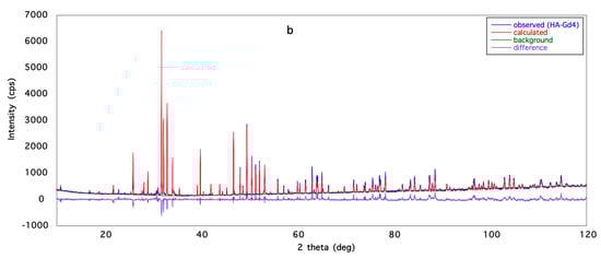 The next step of the structure investigation revealed the hexagonal P63/m space group for the hydroxyapatite [43], while the structure solution was obtained via the direct methods procedure in EXPO, confirming the hexagonal P63/m model reported in [43]. The obtained structure was submitted to structural refinement by the Rietveld method, assuming both calcium sites as possible localizations of the dopant rare earth. Detailed crystallographic results are given in Table 1. The following refinement strategy was applied: in the sites shared by Ca and rare earth, the position and the thermal parameter of both occupants were constrained to be equal, and the sum of Ca and RE occupancies fixed according to the experimental crystal chemical formulas. Moreover, the thermal parameters of P and O atoms were constrained to be equal. Hydrogen atoms were not found by Fourier analysis. The main crystal structure refinements data are reported in Table 1. The agreement between the observed (blue line) and the calculated (red line) diffraction pattern is displayed, together with the background (green line) and the difference pattern plotted on the same scale (violet line), in Figure 2a,b for HA-Eu4 and HA-Gd samples, respectively.