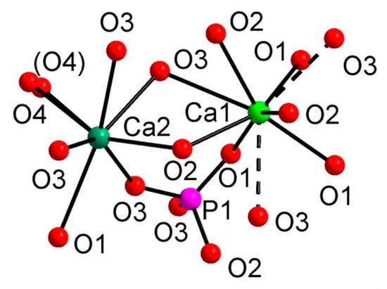 The Ca atoms are engaged in complex co-ordinations: Ca1 in a CaO9 polyhedron (Figure 3), with three couples of bond distances related by symmetry, ranging from 2.406(5)–2.830(4) Å for HA-Eu4, and 2.404(8)–2.833(7) Å for HA-Gd (Table 3). The Ca1-O3 distance slightly exceeds the bonding sphere of Ca, providing a weak contribution to the bond valence [44] to Ca1, as discussed later (see also Table 3). Actually, based on the refined distances, we could describe the Ca1 site as a CaO6 polyhedron, the Ca1···O3 being interpreted as relatively weak interactions. The Ca2 polyhedron displays a CaO6(OH) coordination, resembling a distorted pentagonal bipyramid with five bonds (1xCa2-O1 and two couples of symmetry-related Ca2-O3 bonds) on the equatorial plane, and vertices consisting of one O2 atom and one OH group. The Ca2-O distances are in the range 2.325(4)–2.687(5) Å (HA-Eu4), and 2.300(10)–2.670(13) Å (HA-Gd).