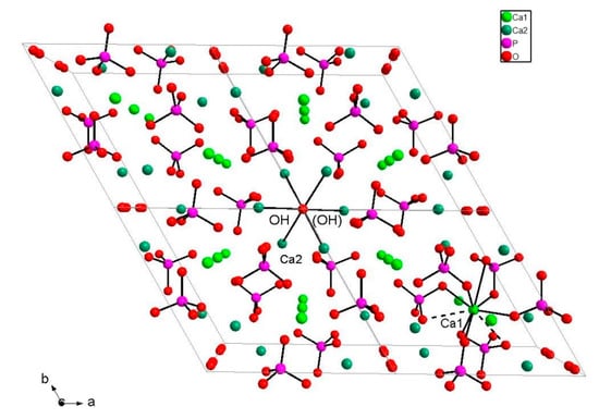 Hexagonal P63/m hydroxyapatite, whose crystal formula can be written as [Ca14Ca26](PO4)6(OH)2, shows a zeolitic character; it can be described as a framework of columns of face-sharing Ca1O6 metaprisms (a polyhedron intermediate between an octahedron and a trigonal prism), corner-connected to PO4 tetrahedra down [001]; such an arrangement indeed creates one-dimensional tunnels occupied by [Ca(2)6(OH)2]10+ counter-ions (Figure 4). The Ca1O6 metaprism is ideally built up by the six strongest Ca-O bond distances; those over 2.8 Å are not considered. The HA framework has the ideal stoichiometry [Ca14(PO4)6]10−, with the hexagonal channel containing [Ca26(OH)2]10+ moieties acting as counter-ions [49], while the Ca1-O3 interactions further stabilize the framework.