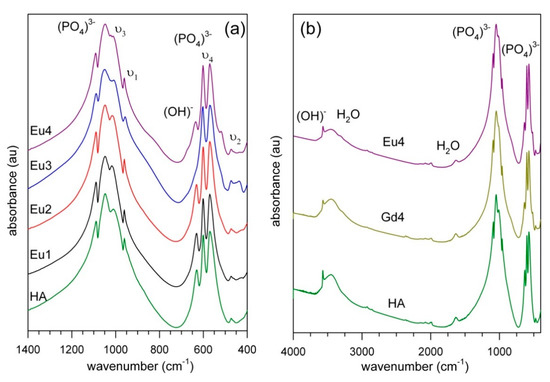 The powder FTIR absorbance spectra of HA-Eu and HA-Gd samples were collected in the 400–4000 cm−1 wavenumber range and are shown in Figure 5, in comparison with the pattern of undoped HA. Measured band positions (wavenumbers, cm−1) are listed in Table 4.