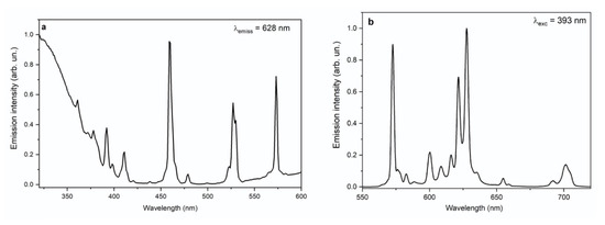 Inspection of the excitation spectra obtained at the 628 nm emission line (Figure 6a), shows that the most intense excitation peak is at 460 nm, corresponding to the 7F0 → 5D2 transition. In addition, a broad band occurs in the 260–350 nm range, that is due to Eu3+-O2− charge transfer (CT band).