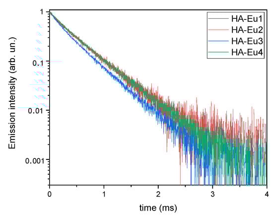 Room temperature luminescence spectra and decay curves were achieved by using a Fluorolog 3 (Horiba-Jobin Yvon) spectrofluorometer (Horiba Ltd., Kyoto, Japan), equipped with a Xe lamp, a double excitation monochromator, a single emission monochromator (Horiba Ltd., Kyoto, Japan) (mod. HR320) and a photomultiplier in photon counting mode for the detection of the emitted signal. The following set up was employed in order to obtain well resolved emission spectra: excitation at 393 nm; integration time: 0.5 s; slits: 5 (in)-2 (out) nm, filter 550 nm, step 0.2 nm. Integration time for HA-Eu4 was lowered to 0.2 s in order to avoid signal saturation. Lifetimes were measured using time-correlated single-photon counting technique (TCSPC), with a xenon microsecond pulsed lamp as excitation source. The decays curves were fitted by the Horiba Jobin Yvon DAS6 instrument software [34].