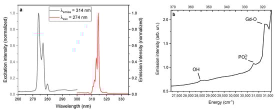 Upon excitation in the 6IJ (J = 7/2–17/2) region, emission bands corresponding to 6P5/2 → 8S7/2 and 6P7/2 → 8S7/2 transitions are observed, with the stronger peak at 314 nm (31,806 cm−1) as observed for Gd3+ in different hosts [68,69,70,71], suitable for potential multimodal applications [23]. It is interesting to point out that weak, but clear vibronic bands are detected at 319.6, 325, and 351 nm in the emission spectrum, located respectively at energy differences from the purely electronic transition that correspond to features present in the FTIR spectrum [72], as reported in Figure 8b. We note that similar sidebands are also observed in the excitation spectrum (not shown here for brevity).