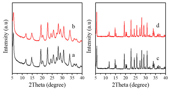 XRD patterns of (a) as-synthesized Fe-LTL-N, (b) calcined Fe-LTL-N, (c) as-synthesized Fe-LTL-C, (d) calcined Fe-LTL-C, respectively.