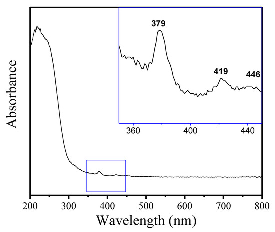 Figure 5 displays the UV-vis spectrum of Fe-LTL-N, exhibiting a strong absorption band at 220 nm with a distinct shoulder at 245 nm and weak bands at 379, 419, and 446 nm, which is in good agreement with the previously reported results [32]. Both bands in the 220–250 nm range correspond to tetrahedral Fe in the zeolite, where the band at 220 nm may be due to a different specific environment of Fe within the zeolite framework. The absorption bands located at 379, 419, and 446 nm are assigned to tetrahedral Fe3+ in the zeolite framework [33]. There were no obvious absorption peaks at near 320 nm, indicating the absence of aggregated FeOx species in the extra-framework.