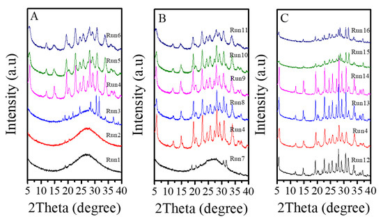 Table 2 presents a systematic investigation on crystallization of Fe-LTL zeolite nanocrystals at 80 °C from aluminosilicate gels in the presence of L precursor. Interestingly, when the K2O/SiO2 in the gels is optimized from 0.122 to 0.300, products of amorphous phase are obtained such as, a mixture of amorphous phase with LTL structure, pure LTL, a mixture of LTL and amorphous (Figure 6A). However, as the K2O/SiO2 ratio in the synthesis gel increases, there is significant broadening and a decrease in height for peaks. Notably, sample obtained under Run 6 with poorer crystallinity shows decrease in height of resolved IR spectrum compared with Fe-LTL-N sample (Figure S1). Combined with the XRD pattern of sample (Run 6), it is probably a mixture of LTL and amorphous [34]. Moreover, the suitable K2O/SiO2 ratio for crystallization of pure LTL structure is changed from 0.229 to 0.265. It is found that the SiO2/Al2O3 ratio has a great influence on the crystallization of LTL zeolite. When the SiO2/Al2O3 ratio is less than 15, it is normally amorphous phase. When this ratio is distributed in the range of 15–25, a pure phase of LTL structure is usually formed (Figure 6B). Figure S1 also shows resolved IR spectra of samples obtained under conditions of Run 10 and 11. Obviously, sample (Run 10) gives similar IR spectrum as that of sample (Run 6), while sample (Run 11) has a further decrease in height for the peaks. Therefore, the sample synthesized under Run 10 and 11 are probably mixture of LTL and amorphous. Furthermore, the FeCl3/SiO2 ratio also influences the crystallization of Fe-LTL zeolite. The Fe content and Si/Al ratios of samples is listed in Table 3. Clearly, samples obtained with more iron content in the initial gel are likely to exhibit higher iron content and Si/Al ratios. As the Figure 6C shows, the increase of iron content up to a certain amount in the initial synthesis gels tends to produce samples with lower crystallinity. When this ratio in the initial gel reaches to 0.07, it is formed a mixture of LTL with amorphous. It has been claimed that the presence of greater concentrations of iron in the gel inhibited the formation of the cancrinite cage due to the larger Fe-O bond length compared to Al-O [34]. Moreover, cancrinite cage is crucial in the formation of LTL zeolites. Thus, the amount of iron in the synthesis gels really has a major impact on crystallinity of Fe-LTL zeolites. Moreover, crystallization temperature has a great effect on the crystallization of zeolite crystals. Figure 7 shows the XRD patterns of Fe-LTL zeolite nanocrystals synthesized with the same ratios of Run 4 at different crystallization temperatures. Reasonably, higher crystallization of Fe-LTL zeolites tends to be obtained at higher crystallization temperatures.