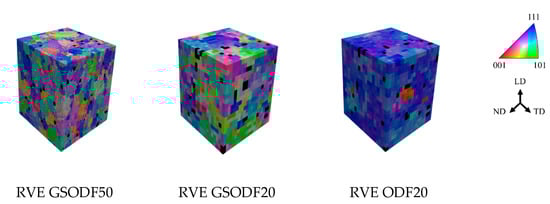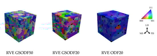 - Orientations are randomly assigned to the grains in the RVE according to the ODF calculated for the corresponding grain size range. The orientations are sampled from the discrete texture obtained evaluating the ODF in a regular grid in Euler space, with a spacing of 5°.