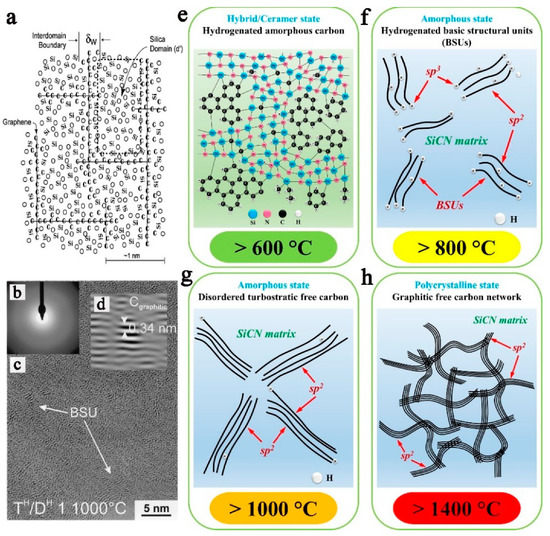 A model of polymer derived ceramics (PDCs) nanodomain (a); high-resolution TEM micrographs of the typical amorphous structure of PDCs (c) pyrolyzed at 1000 °C. The inset (b) displays the selected area electron diffraction (SAED) patterns, indicating the amorphous feature. The inset (d) shows a basic structural unit (BSU) of free carbon with an interplanar distance of around 0.34 nm between the graphene layers; the structural evolution of PDCs at different pyrolysis temperatures: >600 °C (e), >800 °C (f), >1000 °C (g) and >1400 °C (h) [34]. Reproduced with permission from Yu Z., Prog. Mater. Sci.; published by Elsevier, 2020.