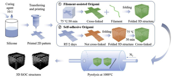 DLP is a commonly used 3D printing technique for PDCs. Mixing the preceramic precursor polymer with the photosensitive resin or modifying the ceramic precursor polymer with a polymer containing photosensitive groups [14,15,29] can render the preceramic precursor polymer photocuring properties, thus it can be easily printed out into various forms by DLP. He’s group [29] prepared polymer-derived Si3N4 honeycomb ceramics using DLP, with compressive strength and elastic modulus of 65.5 MPa and 768.5 MPa, respectively. Lao’s group [15] developed a series of SiOC ceramic precursors for DLP and prepared high-strength and lightweight SiOC ceramics with a fully dense skeleton structure. Moreover, DIW could also be used in the forming of PDCs. Colombo’s group [13] combined 3D printing (DIW) and origami (Figure 2), using high printability and flexibility of silicone elastomers to obtain SiOC ceramics with complex 3D morphologies. Fabrication of PDCs by 3D printing technology can overcome the disadvantages of preparing complex-shaped components in traditional ceramic fabrication techniques and lay the foundation for broadening the application fields of ceramics.