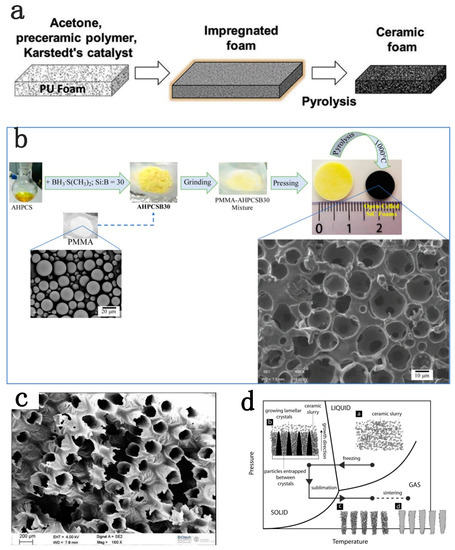 Schematic of impregnating polyurethane (PU) foam with precursor solution to prepare porous SiCN(O) and SiOC mesh foams (a); schematic of preparing high-porosity open-cell SiC foam with polymethyl methacrylate (PMMA) beams as pore-forming agent (b); hollow SiOC ceramic filaments (c); three steps of freeze casting (d) [8,46,64,68]. (a) reproduced with permission from Santhosh B., Ceram. Int.; published by Elsevier, 2020. (b) reproduced with permission from Santhosh B., J. Eur. Ceram. Soc.; published by Elsevier, 2019. (c) reproduced with permission from Kulkarni A., Addit. Manuf.; published by Elsevier, 2020. (d) reproduced with permission from Sylvain D., Adv. Eng. Mater.; published by Wiley, 2008.