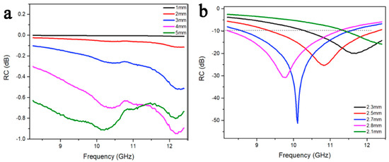 The influence of hierarchical carbon nanowire network on electromagnetic wave absorption properties of PDCs-SiCN. Without hierarchical carbon nanowire network (a); with 5.61 wt% hierarchical carbon nanowire network in PDCs-SiCN (b). The smaller the minimum reflection coefficient, the better the electromagnetic wave absorption properties of the PDCs-SiCN [30]. Reproduced with permission from Ren F., Ceram. Int.; published by Elsevier, 2019.