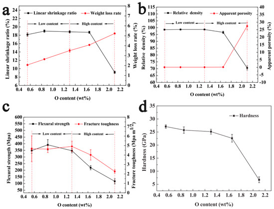 Effect of oxygen content on the mechanical properties of SiC: linear shrinking ratio and weight loss rate (a); relative density and apparent porosity (b); flexural strength and fracture toughness (c); hardness (d) [74]. Reproduced with permission from Feng D., Ceram. Int.; published by Elsevier, 2019.