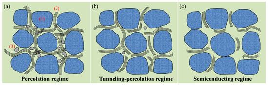 The influence of microstructure on the electrical conductivity of PDCs is mainly on the precipitated free carbon. Free carbon is the main conductive phase in PDCs. Generally, the electrical conductivity of PDCs increases with the increase of free carbon content, the electrical conductivity has a sudden change in the process of increasing, and the percolation threshold (Φc) appears. As Figure 7 shows, the mechanism of the influence of free carbon on the electrical conductivity of PDCs can be divided into three parts [34,81]. When the free carbon content is large enough to far exceed the free carbon required to form a percolation network, the conduction mechanism is the percolation regime, and the conduction of current is achieved by directly transporting charge carriers (such as free electrons). When the free carbon content is only higher than the threshold of the tunneling process between adjacent free carbon clusters without forming a percolation network, the conductive mechanism becomes a tunneling-percolation regime. If the content of free carbon is lower than the tunneling percolation threshold, the conductive mechanism becomes a semiconductor regime.