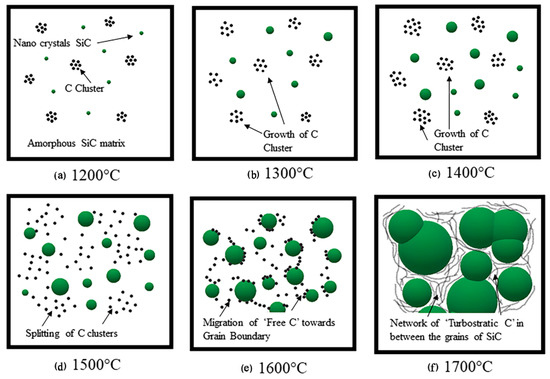 The effect of temperature on the evolution of microstructure. (a) 1200 °C: Carbon clusters in amorphous PDCs-SiC, (b,c) 1300 °C–1400 °C: growth of carbon clusters and crystallization of small amount of SiC, (d) 1500 °C: splitting of carbon clusters into nanocrystallized carbon, (e) 1600 °C: the migration of carbon structure toward the grain boundary of silicon carbide, (f) 1700 °C: excessive grain growth of SiC and formation of grain boundaries; the carbon segregated along the grain boundary forming a network of turbostratic carbon along the grain boundary of SiC [6]. Reproduced with permission from Xu C., J. Am. Ceram. Soc.; published by Wiley, 2019.