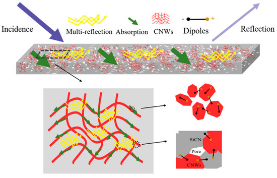 In the previous section, we mentioned that Yin et al. [30] used PDCs-SiCN modified with carbon nanowires (CNWs) network to prepare efficient microwave absorbing materials. RCmin reached −51 dB at a thickness of 2.7 mm, and the EAB was 3.0 GHz, showing excellent microwave absorption performance. This is because CNTs and CNWs materials have a unique one-dimensional structure with a relatively low percolation threshold, which makes it easy to form an effective conductive network [85]. In the dielectric loss, in addition to increasing the conduction loss of PDCs, CNWs have large specific surface area, rough surface, and abundant pits/defects, which also increase the polarization loss of PDCs [86]. Figure 9 depicts the attenuation process when electromagnetic waves interact with PDCs-SiCN/CNWs composites [30]. When the incident electromagnetic wave and the composite material reach impedance matching, a small amount of electromagnetic wave is reflected, and the remaining electromagnetic wave penetrates into the composite material. Once the electromagnetic wave enters the composite material, the unique hierarchical porous structure of CNWs can repeatedly scatter the incoming electromagnetic wave. Therefore, it is difficult for electromagnetic wave to leave the composite material before being attenuated. At the same time, as a typical carbon material, CNWs have excellent electrical conductivity. When CNWs form a conductive network, once an electric field is applied, the incident energy can be converted into current, resulting in strong conduction loss. Moreover, the polarization caused by the internal defects of CNWs also makes a great contribution to the stronger polarization loss. Therefore, many researchers have focused on the development of electromagnetic wave absorbing materials with special microstructures, including porous structures, core-shell structures, and heterostructures. These electromagnetic wave absorbing materials can greatly enhance the electromagnetic wave absorption performance due to interface polarization, multiple reflections, and synergistic effects [19,87,88,89,90].