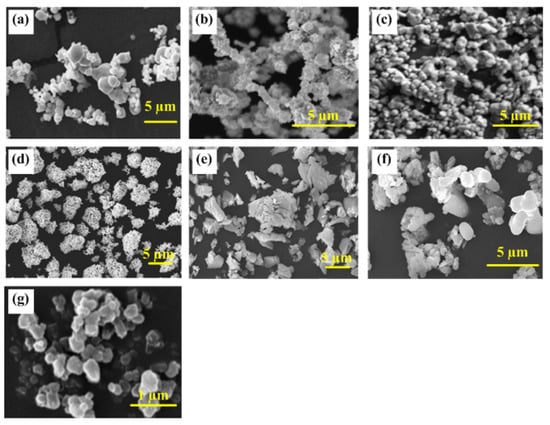 SEM images of the as received metals and rare metal oxide powders, where: (a) W, (b) Ni, (c) Fe, (d) Co, (e) Y2O3, (f) ZrO2, and (g) TiO2.