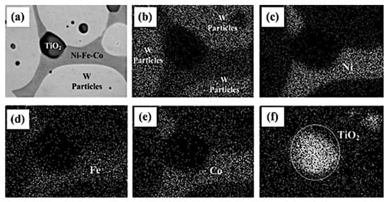 X-ray mapping of TiO2/Ni-Fe-Co-W alloy using SEM-EDS, where: (a) TiO2/Ni-Fe-Co-W, (b) W particles, (c) Ni, (d) Fe, (e) Co and (f) TiO2 particles.