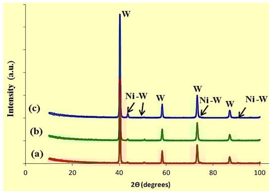 X-ray diffraction analysis (XRD) was performed to identify the phase crystalline structures investigated by the SEM analysis and to determine the phase composition. The XRD investigations of the obtained ODS tungsten heavy alloys revealed that the first set of peaks belongs to the tungsten phase with body centered cubic (BCC) structure, as illustrated in Figure 4. Meanwhile, four weaker peaks, which represent Ni–W solid solution crystalline phase, were observed. However, the minor elements cannot be detected by the X-ray diffraction analysis due to the limitations of the X-ray diffraction technique.