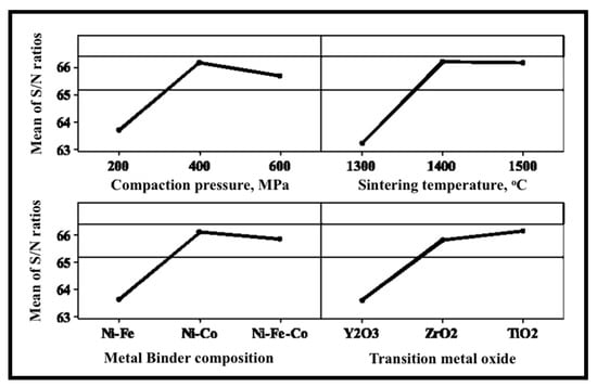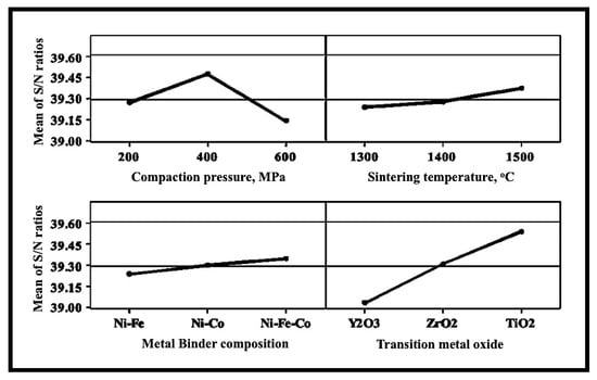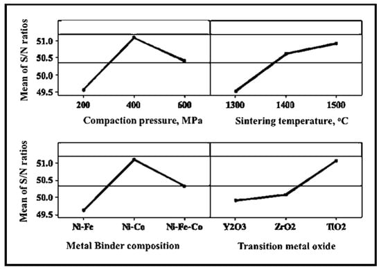 It is noticed from S/N ratio analysis, as shown in Figure 6 and the values of the electrical resistivity listed in Table 2, that the electrical conductivity increases by increasing the sintering temperature. This can be attributed to the lower content of porosity at the higher sintering temperatures and also the presence of the transition metal oxides that reduce the porosity content due to its affinity to inhibit oxidation. As the porosity content increases, the electrical resistivity increases, and this leads to lower values of electrical conductivities []. Moreover, the electrical conductivity increases by increasing compaction pressure until 400 MPa and then decrease at 600 MPa, which can be due to high porosity forming at higher compaction pressure.