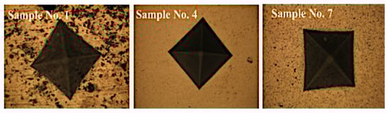 Figure 7 also shows that the hardness increases by increasing the sintering temperature. This may be attributed to the increase in the sintered density and porosity elimination at high temperature during the liquid phase sintering []. The results of S/N ratio analysis also showed that the optimal hardness was at Ni-Co binder material and this agrees with previous research [], which showed that the mechanical properties of W–Ni–Co alloy containing Ni to Co ratios of two to nine are greater than the properties of W–Ni–Fe alloys. The response graph also showed that the optimal hardness is attained at the transition metal oxide type of TiO2. This is attributed to its highest hardness []. Compared to the three kinds of transition metal oxide particles, TiO2 has the most influence on hardness of ODS tungsten heavy alloys. It was discussed in previous reports that the presence of Ti or TiO2 yields significant grain refinement and thus improves hardness []. TiO2 offers excellent physical and chemical stability, which inhibits dislocation and grain growth during sintering. The samples one (W-Ni-Fe-Y2O3) and seven (W-Ni-Fe-Co-ZrO2) have the lowest hardness values and the sample four (W-Ni-Co-TiO2) has the largest hardness value. Microstructures of these specimens, which contain the marks of hardness indentation, are presented in Figure 8. It was observed form the results that the diagonal size of the mark of indentation in samples one and seven is observed to be longer than that of sample four. This may be attributed to the fine structure of sample four and the presence of low porosity content, which increases the hardness. It may further be noted from Figure 8 that; sample one has high porosity content, which reduces the hardness value to the lowest level.