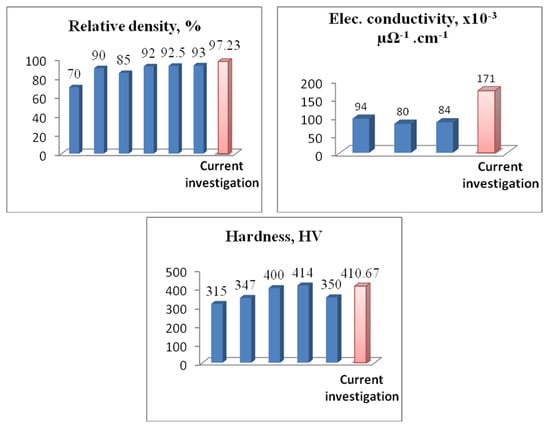 In order to evaluate the experimental results at optimal conditions of the current investigation, there are a number of previous research works that deal with the physical and mechanical properties of WHAs and they were selected for comparison. The selected research work uses parameter levels in the same range of the applied one for the current investigation by the Taguchi method. Figure 11 shows the comparison of the measured properties of relative density, electrical conductivity, and hardness of this investigation with the other data [,,] from previous research works. However, there are no valuable data for compression strength at room temperature of WHAs in literature.