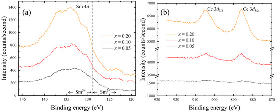 (a) Sm 4d XPS spectrum and (b) Ce 3 XPS spectra collected for the (x = 0.05, 0.10, and 0.20) crystal boules.