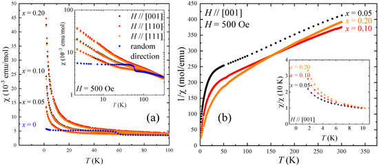 Zero-field-cooled warming (ZFCW) and field-cooled cooling (FCC) magnetisation versus temperature curves were collected on pieces of the (, 0.10 and 0.20) single crystals with an applied field of 500 Oe along three different crystallographic directions ([001], [110] and [111]). The temperature dependence of the magnetic susceptibility, , is shown in Figure 4a. The magnetic susceptibility measured along the different crystallographic directions for all three crystals decreased on warming from 1.8 K to room temperature. In addition, for each composition, the magnetic susceptibilities collected with field applied along the three different high-symmetry directions all overlap to within experimental error across the whole temperature range.