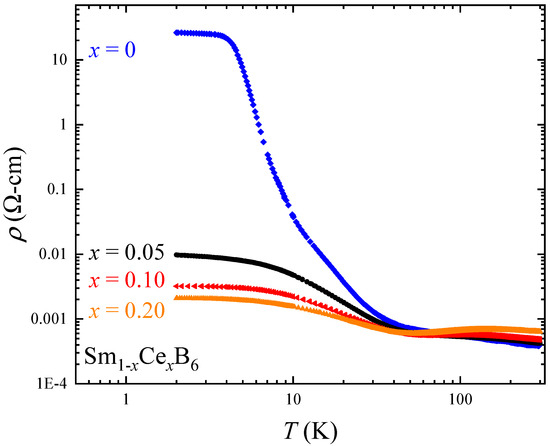 Alternating current resistivity versus temperature, , measurements were made on bar shaped samples cut from the (, 0.10 and 0.20) single crystals. The ac resistivity data are shown in Figure 5 for temperatures between 1.8 and 300 K. These resistivity data are compared with data for a pure SmB crystal grown by the FZ method and reported in our previous work [57]. At 300 K, the samples all have resistivity values similar to SmB and increases with x. Below 300 K, SmB exhibits a continuous increase in the bulk electrical resistivity. In contrast, the data for the Ce-substituted samples exhibit a broad maximum centred around 150 K, followed by an increasingly prominent minimum at ∼50 K. On further cooling below 50 K, the resistivity of SmB increases by four orders of magnitude, whereas the resistivity of the Ce-substituted samples increases by only a single order of magnitude or less. Nevertheless, the samples still have resistivities larger than pure CeB, over the entire temperature range studied. The resistivity of CeB is approximately 10-cm from 2 to 300 K [75], whereas for the samples it is 10-cm or higher over the same temperature range, for the sample.