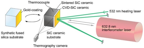 The experimental setup is shown in Figure 1. Synthetic fused silica and SiC ceramic are used for the gold mirror substrate to compare the difference in the effect of thermal load. The mirror surface on a 25 mm cube of the substrate is mechanically polished and coated with gold. The SiC ceramic consists of CVD SiC ceramic more than 3 mm thick deposited on sintered SiC ceramic (Tokai Engineering Service Co., Ltd., Kagamihara, Japan). The surface of the CVD SiC ceramic is used for the mirror because the smaller grain size of CVD SiC ceramic is suitable for polishing with high surface accuracy. The mirrors are set on a mirror holder for 1 × 1 in. optics (MHA-S25, Chuo Precision Industrial Co., Ltd., Tokyo, Japan) or on a black anodized aluminum block as a heat sink to compare the effect of thermal escape on the surface accuracy of the mirrors. The heat in the mirror on the mirror holder is retained because the mirror holder supports the mirrors with three resin-padded points and a set screw with a resin pad. A laser diode with a wavelength of 532 nm is collimated to a diameter of several millimeters and is used to irradiate the gold mirror surface by folding back with mirrors to heat the substrate several times (Figure 1). The absorptions of gold for 532 and 800 nm are ~70% and ~3%, respectively. The total absorbed power is estimated to be ~2 W, which corresponds to ~70 W irradiation at 800 nm in Ti:sapphire lasers usually used for multi-hertz petawatt laser systems. The temperature of the substrates is measured by a thermography camera (Testo 890, Testo SE & Co., KGaA, Lenzkirch, Germany) from the lateral side of the substrate. The emissivity of the measurement is set at 0.94. The accuracy of the measured temperature of the substrates is confirmed with a thermocouple measurement and the difference is within 3%. The mirror is heated for 20 min in air and the deformation of the heated mirror surface is measured immediately with a laser interferometer (GPI XP, Zygo Corporation, Middlefield, CT, USA) after the heating laser is turned off to avoid the effect of scattering from the heating laser.