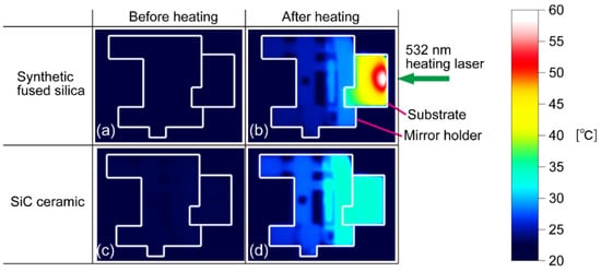 The temperature distributions of the synthetic fused silica and SiC ceramic mirrors set in the mirror holder are measured by the thermography camera before and after 20 min laser irradiation (Figure 2). The substrate is irradiated with the heating laser from the right side. The initial temperature of the substrates is the same as a room temperature of 22.5 °C. The boundaries of the substrates and the mirror holders are not clearly visible before heating (Figure 2a,c); however, the difference in temperature distribution between the substrates is clear after 20 min heating (Figure 2b,d). In the synthetic fused silica substrate, the region close to the gold mirror surface reaches a maximum temperature of ~60 °C. The temperature decreases gradually away from the mirror surface toward the rear side and peripheral area. In contrast, the SiC substrate reaches ~33 °C, with a uniform temperature distribution.