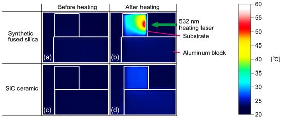 Temperature distributions of substrates placed on the aluminum block are measured from the lateral side with a thermography camera. Temperature distributions of the synthetic fused silica substrate (a) before laser irradiation and (b) after 20 min laser irradiation. Temperature distributions of the SiC ceramic substrate (c) before laser irradiation and (d) after 20 min laser irradiation. White lines show the border of the substrate and the aluminum block as a visual guide. The peak temperatures in (b) and (d) are ~54 and ~26 °C, respectively.